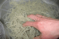 Hぬめりがなくなるまで、麺を洗って下さい。(氷水があれば、仕上げに使ってください。麺がシャキッとして、コシもでます)